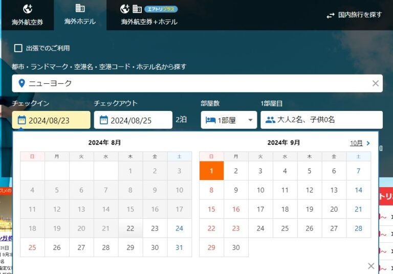 エアトリで海外のホテルを選ぶ場合、出張の有無を選んだ後、都市、ランドマーク、空港名、空港コード、ホテル名から選びます。ランドマークはその地域の目印となるものですが、ランドマークの定義が個人によってあいまいなため、国や都市によって登録されていない場合があるので、都市名のほうが無難です。