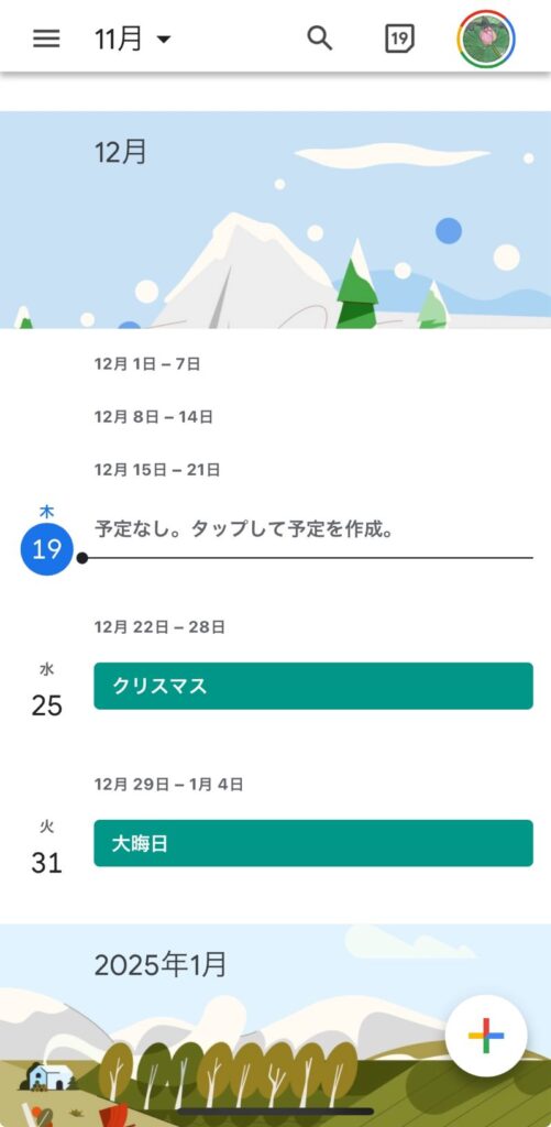 今回はiPhoneを使用してアプリ画面を開きました。初期はスケジュールの単位として項目と、開いた日を示す日付(青丸)、その後は祝日という扱いとして、日本で大事な予定日「クリスマス」と「大晦日」が入っている状況です。予定表示を切り替えるには、左上の横三本線を選びます。