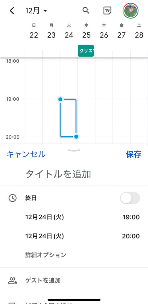 アプリからの予定の作成方法ですが、予定を入れたい日時をタップしますと、下からタイトル追加、スケジュール、ゲストの追加の有無、ビデオ会議の有無、場所、30分前のアラーム設定の有無、詳細入力の追加、Googleドライブからの添付ファイルの追加といった項目が選べます。